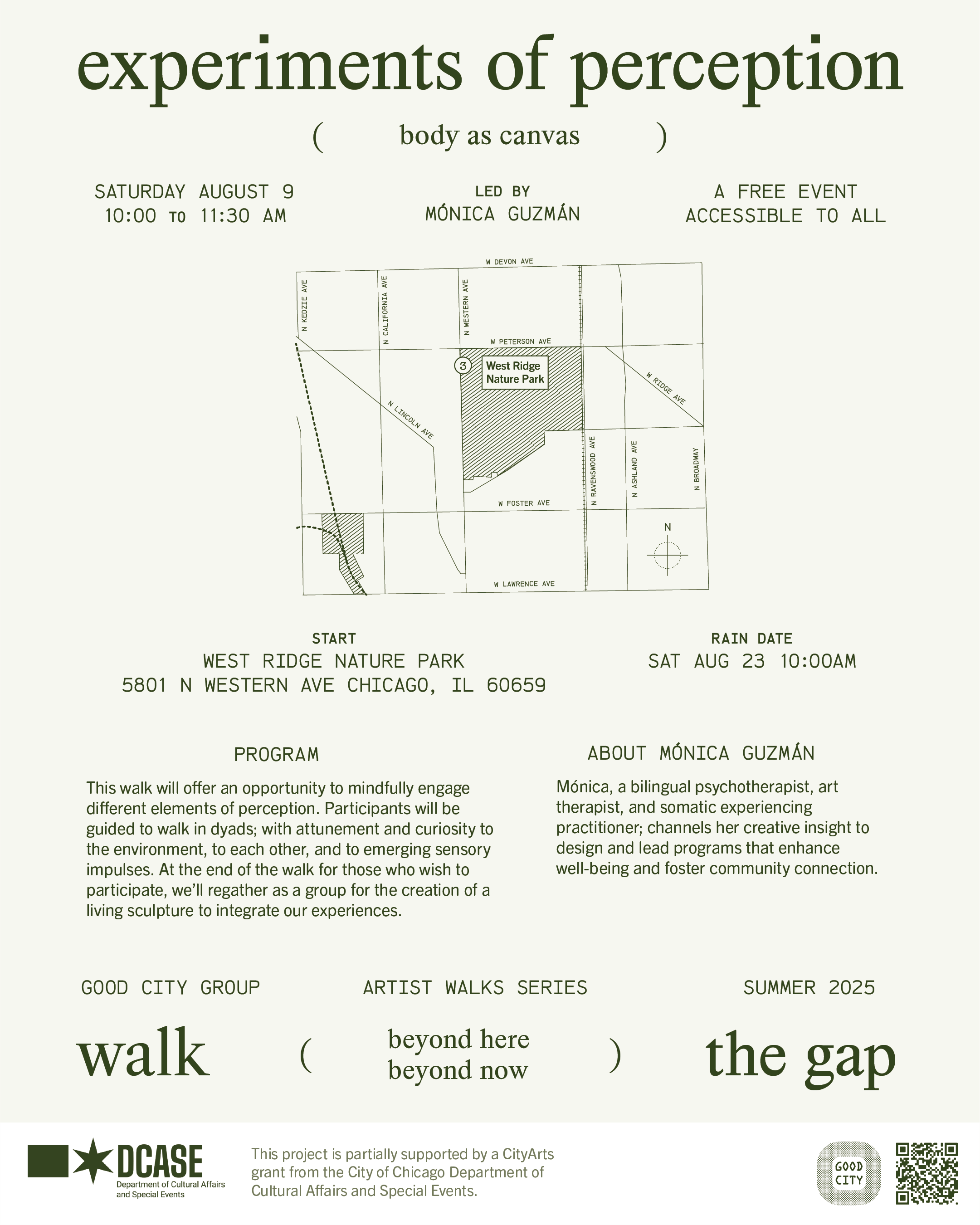 A soundwalk at dusk led in collaboration with Good City Group, as part of the “Beyond Here, Beyond Now” artist walks series.We traced a slow loop from fieldhouse to confluence point, tuning into layered soundscapes shaped by history, infrastructure, and ecology. At the meeting of the North Branch of the Chicago River and the manmade North Shore Channel, we reflected on the park’s position, a story shaped through colonization, industrial engineering, and environmental restoration.